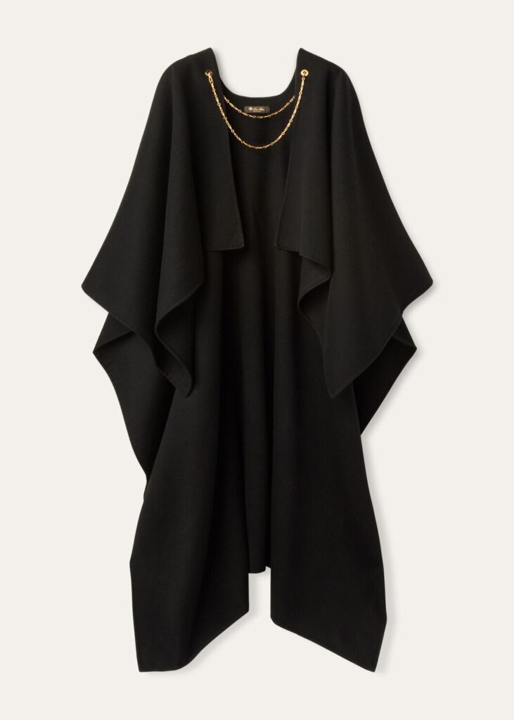 La capa Cecilia es una obra maestra de la moda atemporal. Confeccionada en cachemir de doble capa, su diseño asimétrico ofrece un juego visual dinámico que combina lujo y modernidad. El detalle del cierre de cadena dorada, delicadamente entrelazada con ojales brillantes, añade un toque opulento que convierte a esta capa en el complemento perfecto para un vestido de noche sencillo pero impactante.