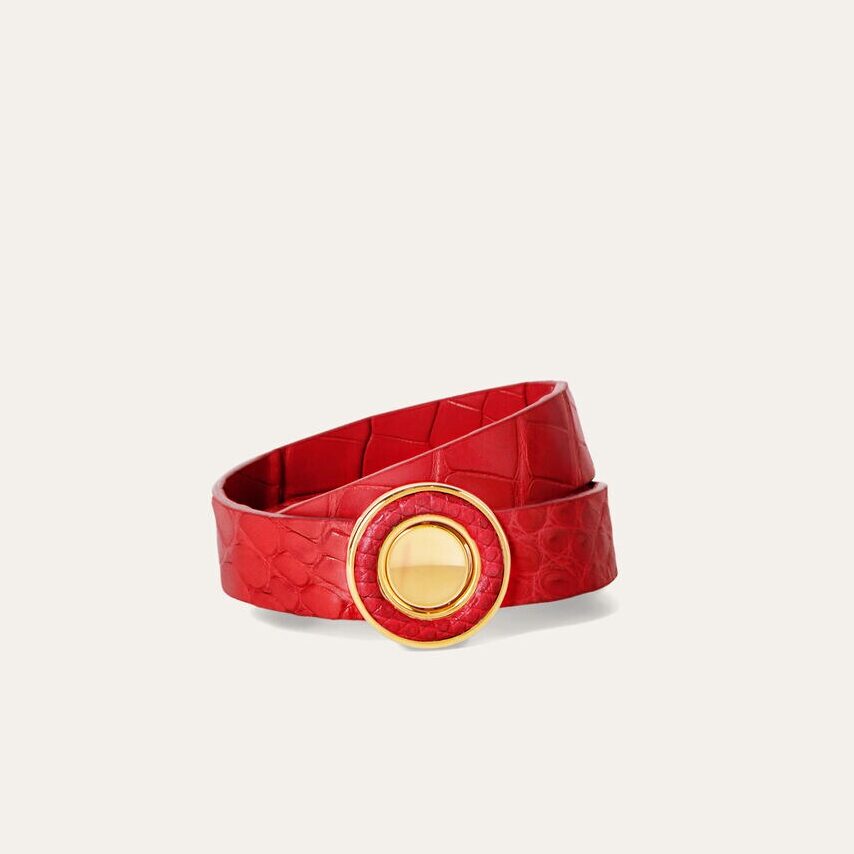 Inspirada en los icónicos bolsos de Loro Piana, la pulsera Ghiera combina a la perfección la opulencia del cuero de aligátor y el latón trabajado artesanalmente. Su diseño de doble vuelta y su cierre parcialmente cubierto de cuero hacen de esta pulsera un accesorio distinguido y versátil. Es la elección perfecta para quienes buscan destacar con una pieza que combina modernidad y tradición.