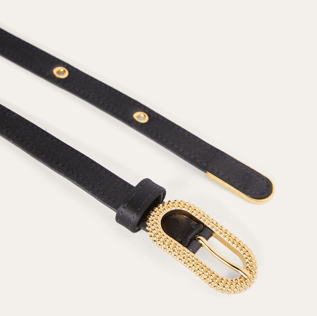 Este cinturón es la definición de glamour refinado. Confeccionado en un suntuoso satén, su diseño delgado se adapta perfectamente a la cintura, añadiendo un toque de elegancia a cualquier conjunto. La hebilla decorativa aporta un brillo discreto, convirtiéndolo en el complemento ideal para eventos especiales o celebraciones nocturnas.