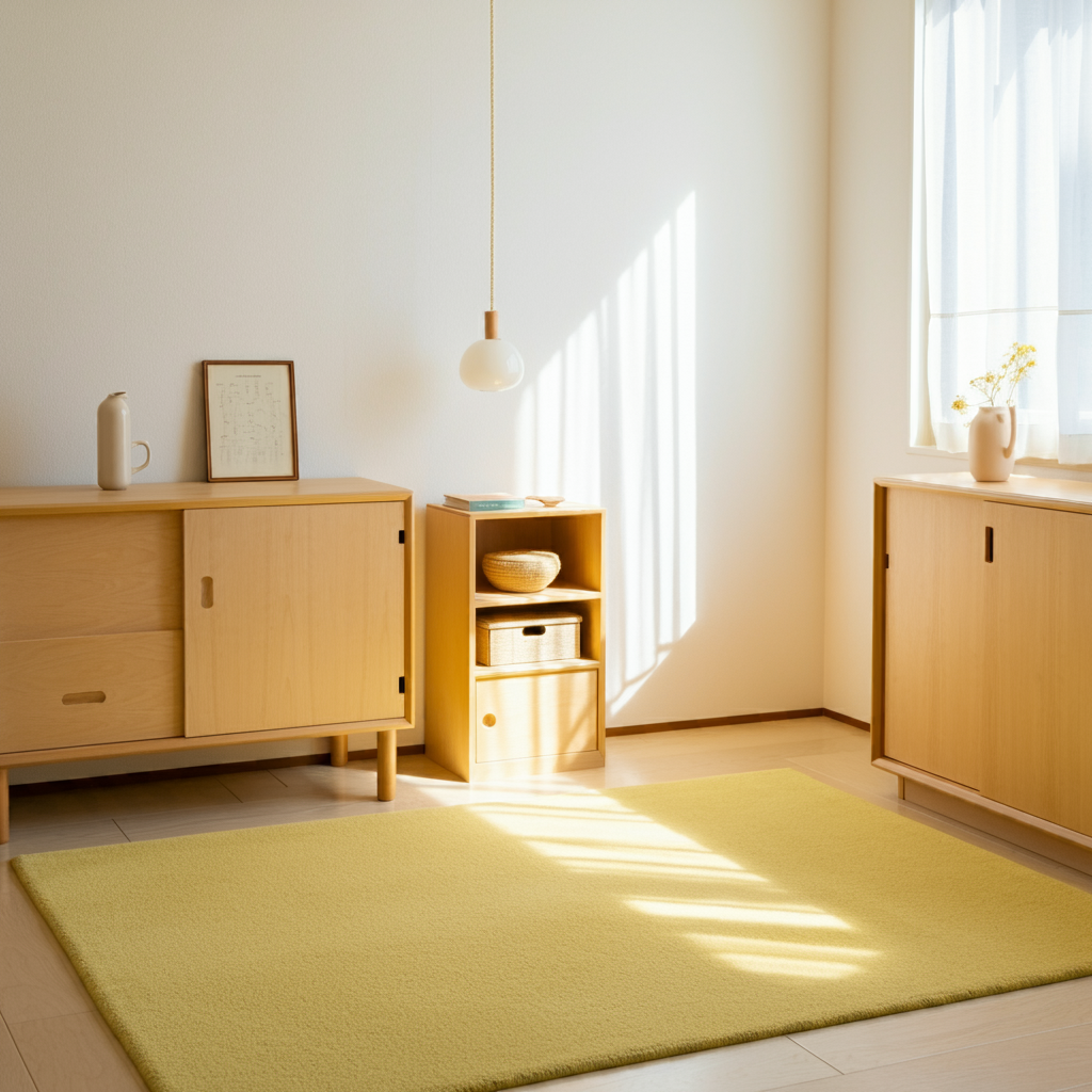 - Textiles simples: Alfombras o cojines en tonos suaves.