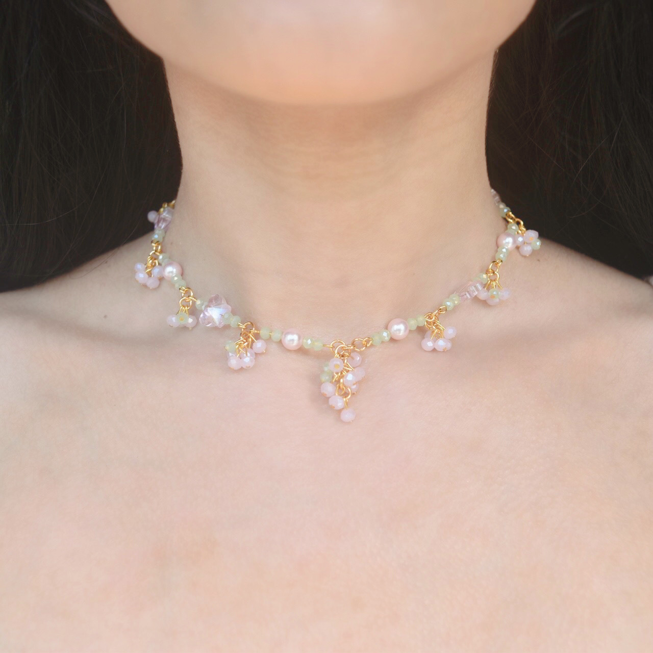 Delicately made with 18k gold plating, glass beads, and glass pearls.